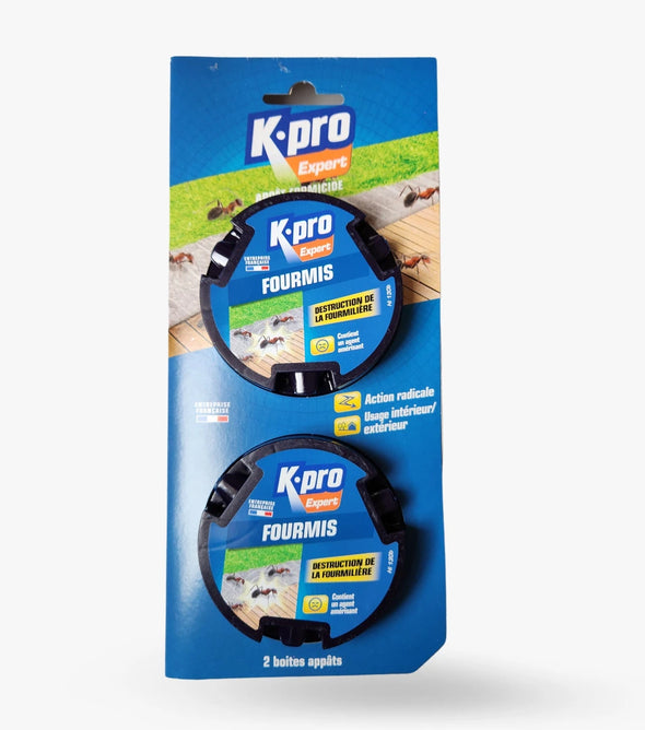 - Des boîtes appât contenant un attractif empoisonné. Le but étant que les fourmis ramènent le poison au cœur de la fourmilière et la détruisent en quelques jours.