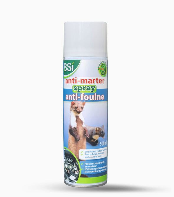 Spray BSI marten repellent in all corners from the attic, under the slopes, gutter entrances, door frames, places that were dirty. In the garage, spray all around the door frames. Also treat around the car and spray the hoses around the engine. This 500 ml spray repellent will keep martens away from your home, but As this is a real turf war, the spraying must be repeated regularly. until they realize that they are not welcome and that there is another occupant here.